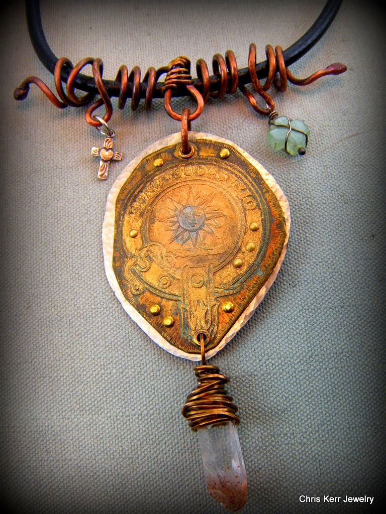 I make jewelry. :-) This year, I wanted to wear something that looked a bit tribal and honored my husband's family name. So I had a piece of etched copper I'd set aside a couple of years ago. The etching was of the Kerr family association crest.